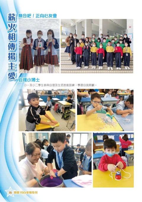 火 相 薪 愛 主 愛 傳 揚 相 火 薪 主 揚 傳 集合吧!正向心友會 集合吧!正向心友會 自理小博士 自理小博士 小一及小二學生參與自理及生活技能訓練,學習自我照顧。 明德70白金禧特刊 36 36 明德70白金禧特刊