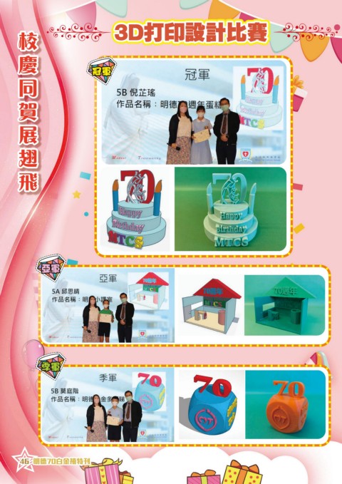 慶 同 校 飛 翅 飛 賀 展 同 慶 校 翅 展 賀 3D打印設計比賽 3D打印設計比賽 冠軍 冠軍 亞軍 亞軍 季軍 季軍 46 明德70白金禧特刊 46 明德70白金禧特刊