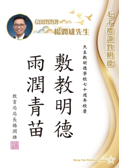 致 讚 德 明 禮 禮 讚 七 十 致 七 十 明 德 教育局局長 教育局局長 楊潤雄先生 楊潤雄先生 週 十 年 慶 校 天 明 教 主 校 七 德 學 Meng Tak Platinum Jubilee 3 3 ubilee Meng T ak Pla tinum J