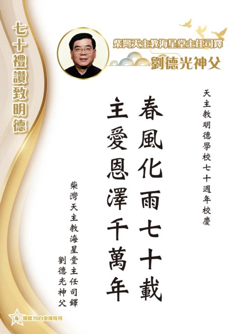 明 致 七 德 十 七 讚 禮 致 明 德 十 禮 讚 柴灣天主教海星堂主任司鐸 柴灣天主教海星堂主任司鐸 劉德光神父 劉德光神父 澤 恩 主 千 愛 年 萬 載 化 風 春 十 七 雨 明 德 學 天 主 教 校 年 校 慶 七 十 週 鐸 司 任 柴 灣 天 海 教 主 主 堂 星 德 劉 光 父 神 6 6 明德70白金禧特刊 明德70白金禧特刊
