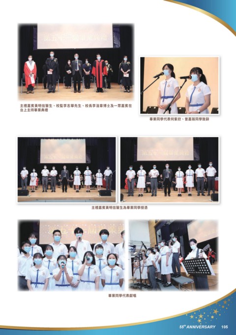主禮嘉賓黃明信醫生、校監李志華先生、校長李淦章博士及一眾嘉賓在 台上主持畢業典禮 畢業同學代表何紫欣、曾嘉薇同學致辭 主禮嘉賓黃明信醫生為畢業同學授憑 畢業同學代表獻唱 th 55 ANNIVERSARY 105