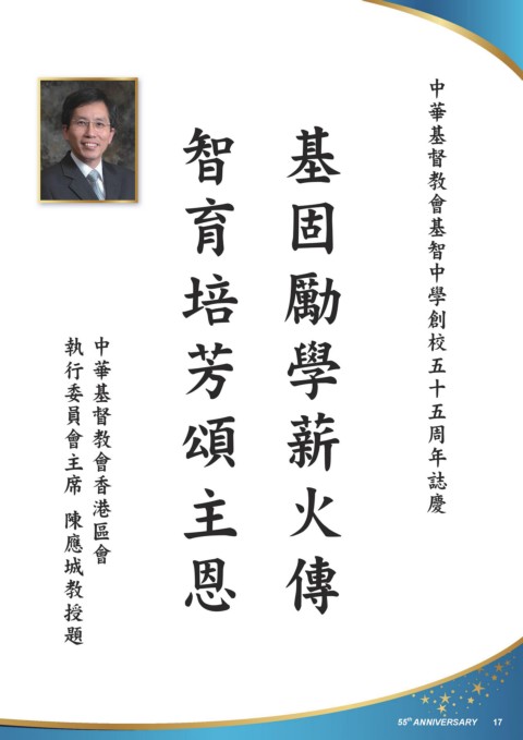 五 十 創 校 五 誌 慶 周 年 學 基 督 中 華 教 智 中 會 基 育 智 芳 培 主 恩 頌 傳 基 學 薪 火 固 勵 委 行 執 員 席 主 會 香 會 教 會 區 港 華 中 督 基 陳 應 題 城 授 教 th 55 ANNIVERSARY 17