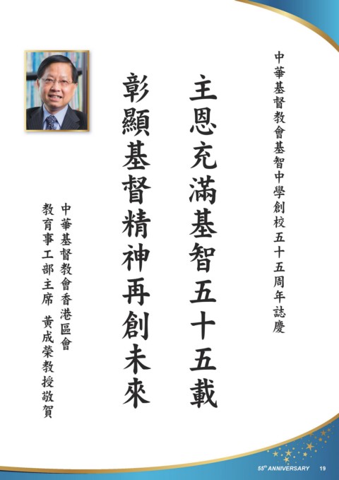 創 督 再 精 神 基 未 來 顯 彰 恩 主 五 智 載 十 五 充 滿 基 五 校 五 十 創 智 基 學 中 周 基 督 中 華 教 誌 年 會 慶 事 育 教 工 席 主 部 教 會 基 督 區 會 香 港 華 中 教 榮 成 賀 敬 授 黃 th 55 ANNIVERSARY 19
