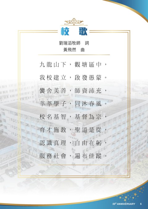 校 歌 劉瑞滔牧師 詞 黃飛然 曲 九龍山下,觀塘區中, 我校建立,啟發愚蒙。 黌舍美善,師資沛充, 莘莘學子,同沐春風。 校名基智,基督為宗, 育才施教,聖道是從, 認識真理,自由在躬, 服務社會,遍布佳蹤。 th 55 ANNIVERSARY 5