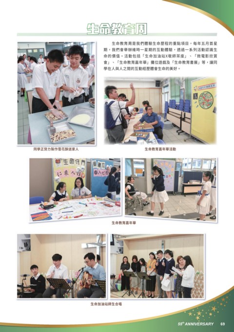 生命教育周 生命教育周是我們體驗生命歷程的重點項目,每年五月首星 期,我們會舉辦維時一星期的互動體驗,透過一系列活動認識生 命的價值。活動包括「生命加油站X敬師茶座」、「微電影欣賞 會」、「生命教育嘉年華」攤位遊戲及「生命教育書展」等,讓同 學在人與人之間的互動經歷體會生命的美好。 同學正努力製作雪花酥送家人 生命教育嘉年華活動 生命教育嘉年華 生命加油站師生合唱 th 55 ANNIVERSARY 69