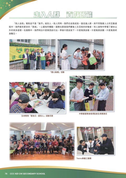 程中,我們看到更多的「真相」,心靈有所觸動。服務社群是我們體會人生百態的好機會,待人接物中學懂了課本以