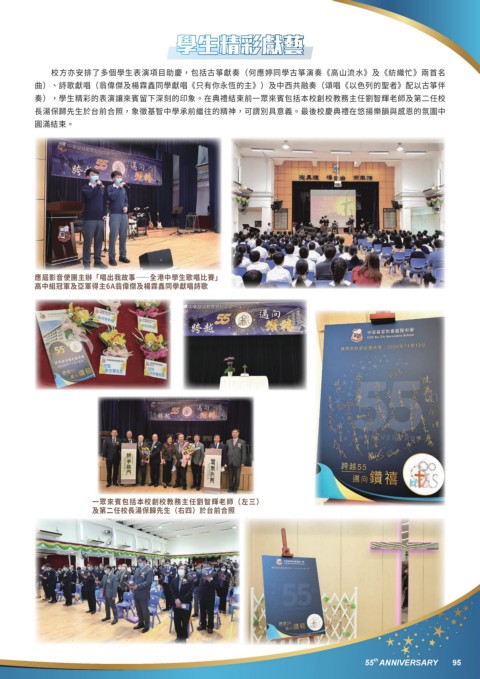 校方亦安排了多個學生表演項目助慶,包括古箏獻奏(何應婷同學古箏演奏《高山流水》及《紡織忙》兩首名