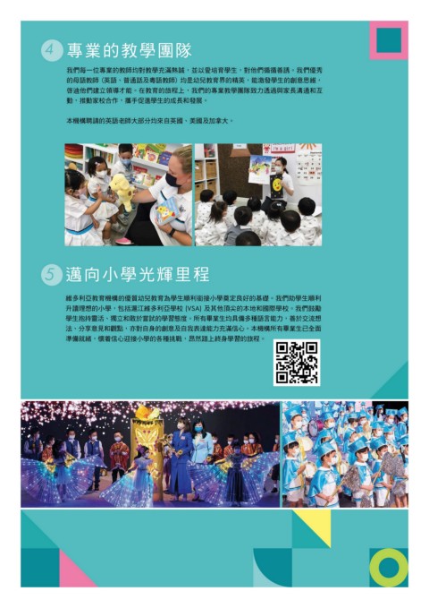 的母語教師 (英語、普通話及粵語教師) 均是幼兒教育界的精英,能激發學生的創意思維,