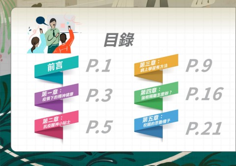 目錄 前言 P.1 第三章: P.9 網上學習有方法 第一章: 第四章: 疫情下的精神健康 P.3 強檢隔離怎麼辦? P.16 第二章: 第五章: 抗疫醒神小貼士 P.5 校園的思動種子 P.21