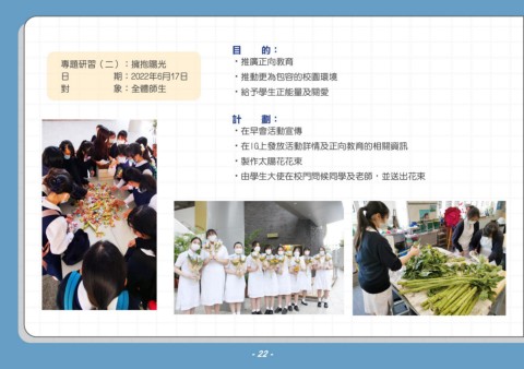 目 的: 專題研習(二):擁抱陽光 .推廣正向教育 日 期:2022年6月17日 .推動更為包容的校園環境 對 象:全體師生 .給予學生正能量及關愛 計 劃: .在早會活動宣傳 .在IG上發放活動詳情及正向教育的相關資訊 .製作太陽花花束 .由學生大使在校門問候同學及老師,並送出花束 - 22 - - 22 -