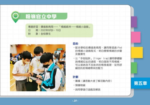 粉嶺官立中學 專題研習:價值教育周—「情緒綠洲—情緒小遊戲」 日 期:2022年6月9、10日 對 象:全校學生 目的 .配合學校的價值教育周,讓同學透過iPad 的情緒小遊戲程式,明白覺察情緒的步驟 及重要性 .以「手指陷阱」(finger trap)讓同學體驗 與情緒拉扯的過程,明白面對不同情緒, 可以接納及不加批判的態度處理,從而舒 緩因抗拒情緒帶來的壓力 計劃 .籌備(讓思動大使了解活動內容) 第五章 .預備物資 .與同學進行遊戲及解說 - - 25 - 25 -