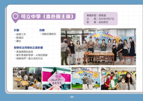 可立中學(嗇色園主辦) 專題研習:感恩週 日 期:2022年5月27日 對 象:全校師生 計劃 回饋 .前期工作 .活動反應熱烈 .點唱站 .攤位 對學校及同學的正面影響 .表達感恩的途徑 .樂於表達對老師、父母的感謝 .感謝他們一直以來的付出 - 30 - - - 30