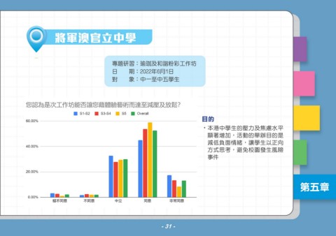 將軍澳官立中學 專題研習:感恩週 日 期:2022年5月27日 對 象:全校師生 專題研習:瑜珈及和諧粉彩工作坊 日 期:2022年6月1日 對 象:中一至中五學生 目的 .本港中學生的壓力及焦慮水平 顯著增加,活動的舉辦目的是 減低負面情緒,讓學生以正向 方式思考,避免校園發生風險 事件 第五章 - 31 - - 31 -