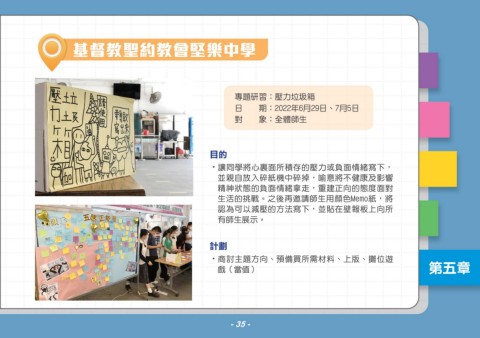 基督教聖約教會堅樂中學 專題研習:壓力垃圾箱 日 期:2022年6月29日、7月5日 對 象:全體師生 目的 .讓同學將心裏面所積存的壓力或負面情緒寫下, 並親自放入碎紙機中碎掉,喻意將不健康及影響 精神狀態的負面情緒拿走,重建正向的態度面對 生活的挑戰。之後再邀請師生用顏色Memo紙,將 認為可以減壓的方法寫下,並貼在壁報板上向所 有師生展示。 計劃 .商討主題方向、預備買所需材料、上版、攤位遊 戲(當值) 第五章 35 - - - 35 -