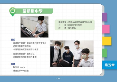 聖類斯中學 專題研習:透過作曲反思疫情下的生活 日 期:2022年1月至8月 對 象:全校師生 目的 .透過創作歌曲,歌曲及歌詞創作者可以 ※運用音樂表達感情 ※運用音樂反思疫情下的生活 .透過聆聽歌曲,觀眾可以 ※察覺並感恩身邊的人事物 宣傳 第五章 .製作IG posts .邀請老師一同唱歌 - - 37 - 37 -