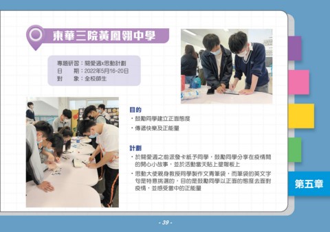 東華三院黃鳳翎中學 專題研習:關愛週x思動計劃 日 期:2022年5月16-20日 對 象:全校師生 目的 .鼓勵同學建立正面態度 .傳遞快樂及正能量 計劃 .於關愛週之前派發卡紙予同學,鼓勵同學分享在疫情間 的開心小故事,並於活動當天貼上壁報板上 .思動大使親身教授同學製作文青筆袋,而筆袋的英文字 句是特意挑選的,目的是鼓勵同學以正面的態度去面對 第五章 疫情,並感受當中的正能量 - 39 - - 39 -