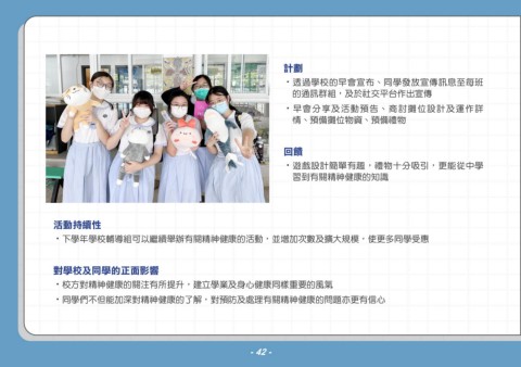 .下學年學校輔導組可以繼續舉辦有關精神健康的活動,並增加次數及擴大規模,使更多同學受惠
