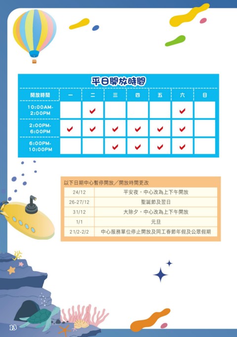 平日開放時間 平日開放時間 開放時間 一 二 三 四 五 六 日 10:00AM- 2:00PM 2:00PM- 6:00PM 6:00PM- 10:00PM 以下日期中心暫停開放╱開放時間更改 24/12 平安夜,中心改為上下午開放 26-27/12 聖誕節及翌日 31/12 大除夕,中心改為上下午開放 1/1 元旦 21/2-2/2 中心服務單位停止開放及同工春節年假及公眾假期 13 13
