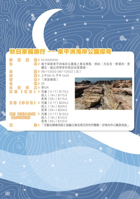 內 容 容 內 : : 親子探索東平洲海岸公園島上著名景點,例如︰天后宮、斬頸洲、更