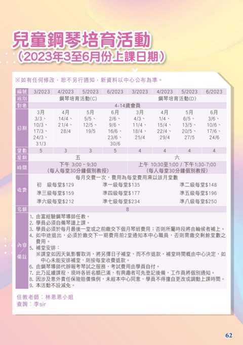 備註 ※課堂如因天氣影響取消,將另擇日子補堂,而不作退款,補堂時間概由中心決定,如