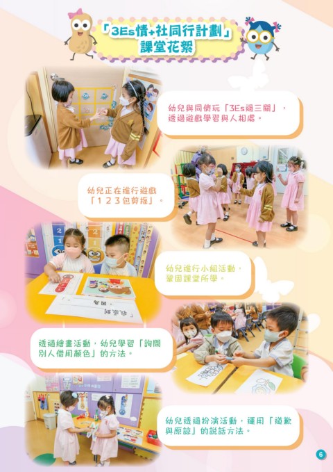 「3Es情+社同行計劃」 「3Es情+社同行計劃」 課堂花絮 課堂花絮 幼兒與同儕玩「3Es過三關」, 透過遊戲學習與人相處。 幼兒正在進行遊戲 「123包剪揼」。 幼兒進行小組活動, 鞏固課堂所學。 透過繪畫活動,幼兒學習「詢問 別人借用顏色」的方法。 幼兒透過扮演活動,運用「道歉 與原諒」的說話方法。 6