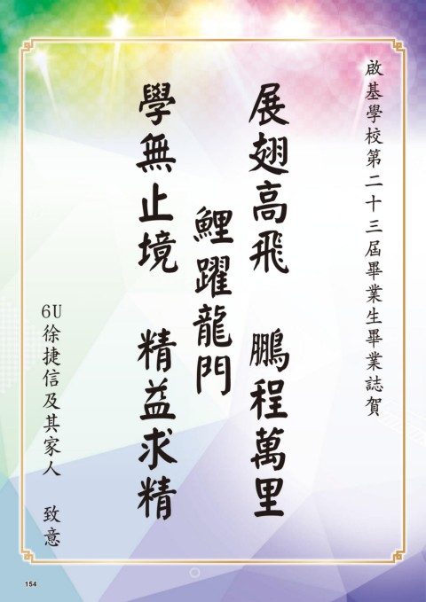 止 境 學 無 高 飛 展 翅 三 十 畢 屆 基 啟 二 第 賀 誌 學 校 生 業 業 畢 龍 門 鯉 躍 精 精 鵬 求 益 里 萬 程 6U 人 徐 其 家 捷 及 信 致 意 154 154