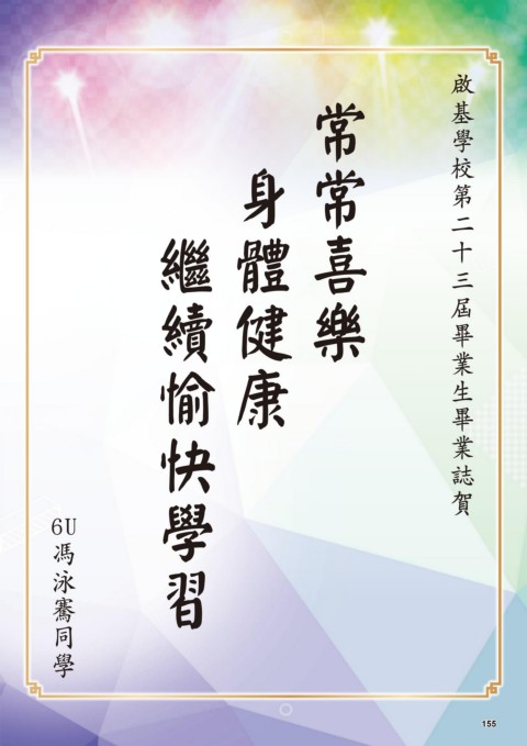 常 常 樂 喜 生 業 業 畢 三 十 畢 屆 學 校 啟 基 賀 誌 第 二 身 體 康 健 續 繼 愉 習 學 快 6U 馮 泳 騫 同 學 155 155