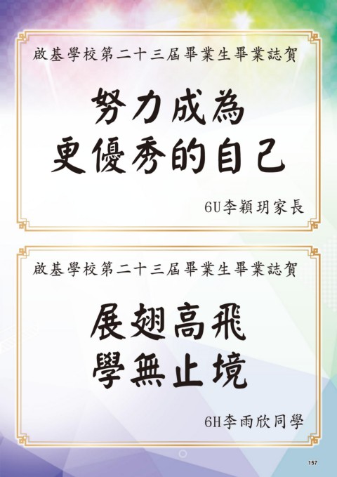 啟基學校第二十三屆畢業生畢業誌賀 努力成為 更優秀的自己 6U李穎玥家長 啟基學校第二十三屆畢業生畢業誌賀 展翅高飛 學無止境 6H李雨欣同學 157 157