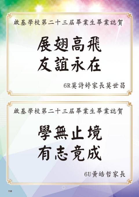 啟基學校第二十三屆畢業生畢業誌賀 展翅高飛 友誼永在 6R莫詩婷家長莫世昌 啟基學校第二十三屆畢業生畢業誌賀 學無止境 有志竟成 6U黃皓哲家長 158 158