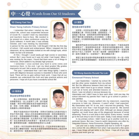 classroom, all my classmates looked at me with strange eyes, which 們的中學生活能重回軌道。雖然這一年能參與的活動不多,但我在機