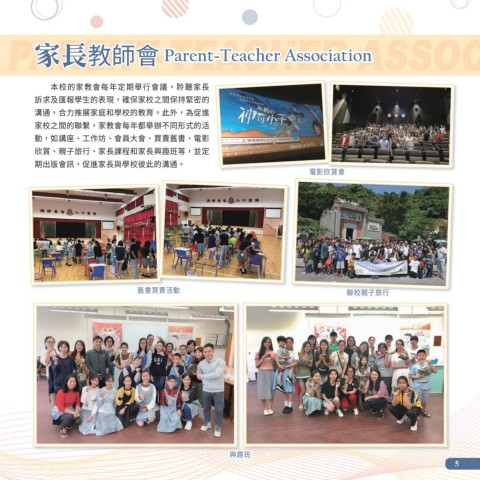 家長教師會 Parent-Teacher Association 本校的家教會每年定期舉行會議,聆聽家長 訴求及匯報學生的表現,確保家校之間保持緊密的 溝通,合力推展家庭和學校的教育。此外,為促進 家校之間的聯繫,家教會每年都舉辦不同形式的活 動,如講座、工作坊、會員大會、買賣舊書、電影 欣賞、親子旅行、家長課程和家長興趣班等,並定 期出版會訊,促進家長與學校彼此的溝通。 電影欣賞會 舊書買賣活動 聯校親子旅行 興趣班 5