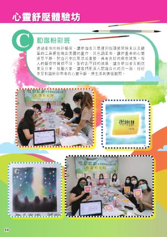 心靈舒壓體驗坊 C 和諧粉彩班 和諧粉彩班 透過柔和的粉彩藝術,讓參加者只需運用指頭推開粉末以及簡 單的工具便能做出美麗的畫作,其色調柔和,讓作畫者的心靈 達至平靜,對自己作出反思或重整,具有良好的療愈效果。每 人的藝術特質都不同,製作出不同的效果,讓各參加者互相欣 賞及分享,鼓勵大家,讓我們更深入認識自己的另一面,好好 享受和諧粉彩帶來的心靈平靜,將生活的煩惱拋開。 10 10