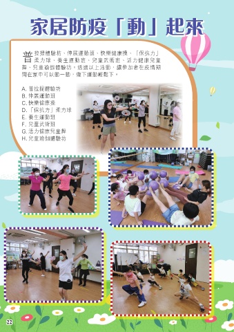 家居防疫「動」起來 拉提體驗坊、伸展運動班、快樂健康操、「保抗力」 普 柔力球、養生運動班、兒童武術班、活力健康兒童 舞、兒童瑜伽體驗坊。透過以上活動,讓參加者在疫情期 間在家中可以動一動,做下運動輕鬆下。 A. 普拉提體驗坊 B. 伸展運動班 C. 快樂健康操 D. 「保抗力」柔力球 E. 養生運動班 F. 兒童武術班 G. 活力健康兒童舞 H. 兒童瑜伽體驗坊 22 22