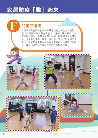 家居防疫「動」起來 F 兒童武術班 兒童武術班 武術是少數能同時能訓練各種身體能力的全方位運動, 在出拳與踢腿時,產生爆發力;身體大開大展時,必 須柔軟有彈性;弓箭步、馬步站樁,能鍛鍊身體的肌耐 力;套路中的伸展、轉身、收放等,更能提高身體的協 調性,對我們的身體以及心靈是有益的。透過簡單的動 作,讓參加者可以在家中抗疫做武術強身健體。 30 30