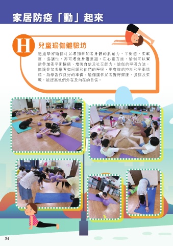 家居防疫「動」起來 H 兒童瑜伽體驗坊 兒童瑜伽體驗坊 透過學習瑜伽可以增加參加者身體的肌耐力,平衡感,柔軟 度,協調性,亦可增強身體意識。在心靈方面,瑜伽可以幫 助參加者平衡情緒、增強自信及社交能力。瑜伽的呼吸方法, 能讓參加者學習如何緩和他們的呼吸,更有效的控制和平衡情 緒,為學習作良好的準備。瑜伽讓參加者覺得健康、強健及柔 軟,能提高他們外在及內在的自信。 34 34