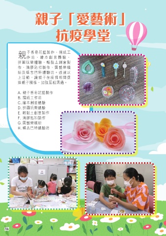 親子「愛藝術」 抗疫學堂 子香皂花籃製作、摺紙工 親 作坊、繪本創意體驗、 拼圖玩樂體驗、輕黏土創意製 作、滴膠匙扣製作、園藝樂繽 紛及蝶古巴特體驗坊。透過以 上活動,讓親子在疫情期間促 進親子關係,加強互相溝通。 A. 親子香皂花籃製作 B. 摺紙工作坊 C. 繪本創意體驗 D. 拼圖玩樂體驗 E. 輕黏土創意製作 F. 滴膠匙扣製作 G. 園藝樂繽紛 H. 蝶古巴特體驗坊 36 36