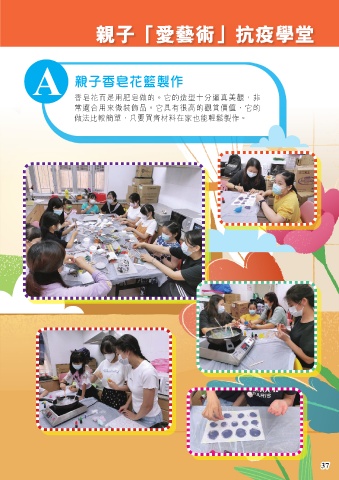 親子「愛藝術」抗疫學堂 A 親子香皂花籃製作 親子香皂花籃製作 香皂花而是用肥皂做的。它的造型十分逼真美觀,非 常適合用來做裝飾品。它具有很高的觀賞價值,它的 做法比較簡單,只要買齊材料在家也能輕鬆製作。 37 37