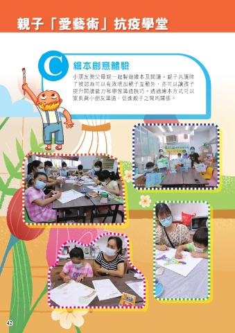 親子「愛藝術」抗疫學堂 C 繪本創意體驗 繪本創意體驗 小朋友與父母親一起製做繪本及閱讀。親子共讀除 了被認為可以有效增加親子互動外,亦可以讓孩子 提升閱讀能力和學習溝通技巧。透過繪本方式可以 家長與小朋友溝通,促進親子之間的關係。 42 42