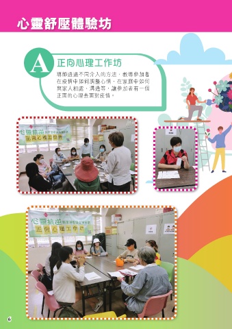 心靈舒壓體驗坊 A 正向心理工作坊 正向心理工作坊 導師透過不同介入的方法,教導參加者 在疫情中如何調整心情,在家庭中如何 與家人相處、溝通等,讓參加者有一個 正面的心理去面對疫情。 6 6