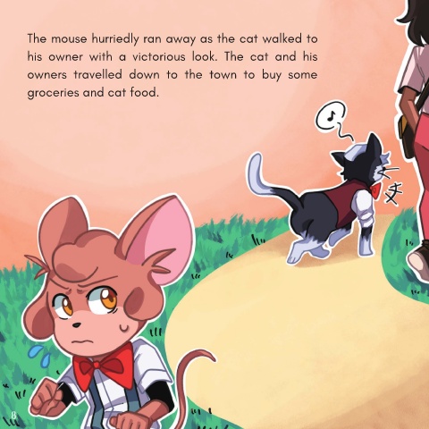 The mouse hurriedly ran away as the cat walked to his owner with a victorious look. The cat and his owners travelled down to the town to buy some groceries and cat food. Blinded by success, the cat got lost! 8 9