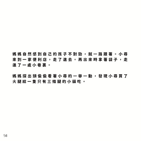 媽 媽 自 然 感 到 自 己 的 孩 子 不 對 勁 , 就 一 路 跟 著 。 小 尋 來 到 一 家 便 利 店 , 走 了 進 去 。 再 出 來 時 拿 著 袋 子 , 走 進 了 一 處 小 巷 裏 。 媽 媽 探 出 頭 偷 偷 看 著 小 尋 的 一 舉 一 動 , 發 現 小 尋 買 了 火 腿 給 一 隻 只 有 三 條 腿 的 小 貓 吃 。 58