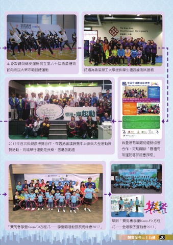 本會教練與精英運動員在第六十屆香港體育 節向市民大眾示範健體運動 持續為香港理工大學提供學生體適能測試服務 2016年首次與健康博覽合作,在香港會議展覽中心參與大型運動展 與臺灣有氧體能運動協會 覽活動,同場舉行運動是良藥•香港啟動禮 合作,定期開辦「團體有 氧運動導師證書課程」 舉辦「賽馬會學童Keep-Fit方程 「賽馬會學童Keep-Fit方程式—學童體適能發展高峰會2017」 式—全港親子運動會2017」 20 創會至今三十五載 20
