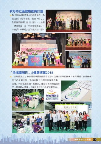 我好叻社區健康推廣計劃 ⭐ 為了加強社區協作共同推廣健康,衞 生署自2012年開展「我好『叻』」 社區健康推廣計劃(計劃),以推廣 「健康飲食」和「恆常體能活動」。 本會多年來積極支持和參與該計劃。 「全城體測日」@健康博覽2018 ⭐ 「全城體測日」由中國香港體適能總會主辦,並獲多個學術機構、專業團體、社福機構 及工商企業支持。透過大型公共關係及推廣活動, 喚起大眾的健康意識,使更多人關注自己的體適能狀 況、骨骼肌肉健康、代謝症候群及心血管健康風險。 38 創會至今三十五載 38