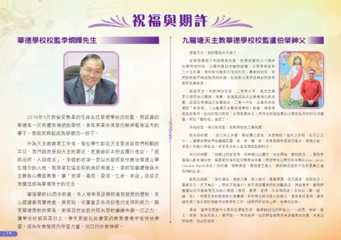 華德是一所有優良傳統的學校,多年來秉承基督的精神服務區內的 作為校友、神父和校監,我對學校有三種祝願: