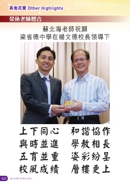 Չ˼ڀഔ Other Highlights 榮休老師贈言 蘇北海老師祝願 梁省德中學在楊文德校長領導下 上下同心 和諧協作 與時並進 學教相長 五育並重 姿彩紛呈 校風成績 層樓更上 112 AD & FD POHL LSTC