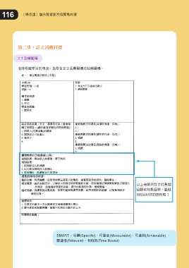 116 ኪܠ༺ፄΥԃᅂ˪ࡈࣩҿࢁ 第二步:訂立活動目標 2.1 ᇖᇍᖚ ϼࢪ࣬ኽኪ͛ٙઋرdމኪ֛͛ͭڗಂͦᅺʿಂͦᅺf ˸ɪϼࢪהࠈͭٙڗಂ ͦᅺձಂͦᅺdঐਂ ՑSMARTٙࡡۆk SMART - Ո(Specific)e̙ඎܓ(Measurable)e̙༺Ց(Achievable) e ᗫஹ(Relevant)eϞࣛࠢ(Time Bound)