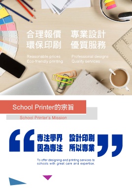 合理報價 專業設計 環保印刷 優質服務 Reasonable prices Professional designs Eco-friendly printing Quality services School Printer的宗旨 “ School Printer's Mission 專注學界 設計印刷 因為專注 所以專業 ” To offer designing and printing services to schools with great care and expertise.