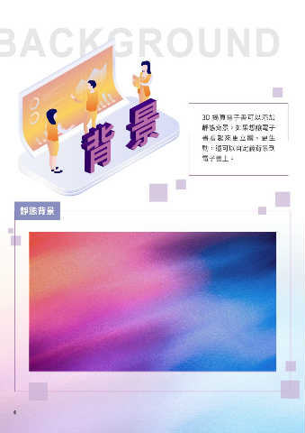 BACKGROUND 3D 揭頁電子書可以添加 靜態背景,如果想讓電子 書看起來更立體、更生 動,還可以自定義背景到 電子書上。 靜態背景 4