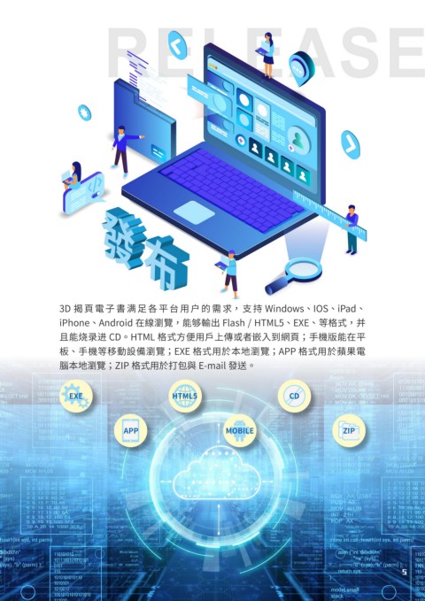 RELEASE 3D 揭頁電子書满足各平台用户的需求,支持 Windows、IOS、iPad、 iPhone、Android 在線瀏覽,能够輸出 Flash / HTML5、EXE、等格式,并 且能烧录进 CD。HTML 格式方便用戶上傳或者嵌入到網頁;手機版能在平 板、手機等移動設備瀏覽;EXE 格式用於本地瀏覽;APP 格式用於蘋果電 腦本地瀏覽;ZIP 格式用於打包與 E-mail 發送。 EXE HTML5 CD APP MOBILE ZIP 5