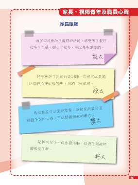 家長、視障青年及職員心聲 家長心聲 自從女兒參加了你們的活動,她學會了製作 很多手工藝,開心了很多,所以要多謝你們。 甄太 兒子參加了定向行走訓練,令他可以更獨 立地往返中心及家中,我們十分欣慰。 陳太 各位家長可以定期聚會,互相交流及分享 照顧子女的心得,可以舒緩彼此的壓力。 黎太 能夠同兒子一同參與活動,促進了彼此的 關係及了解。 林太 36
